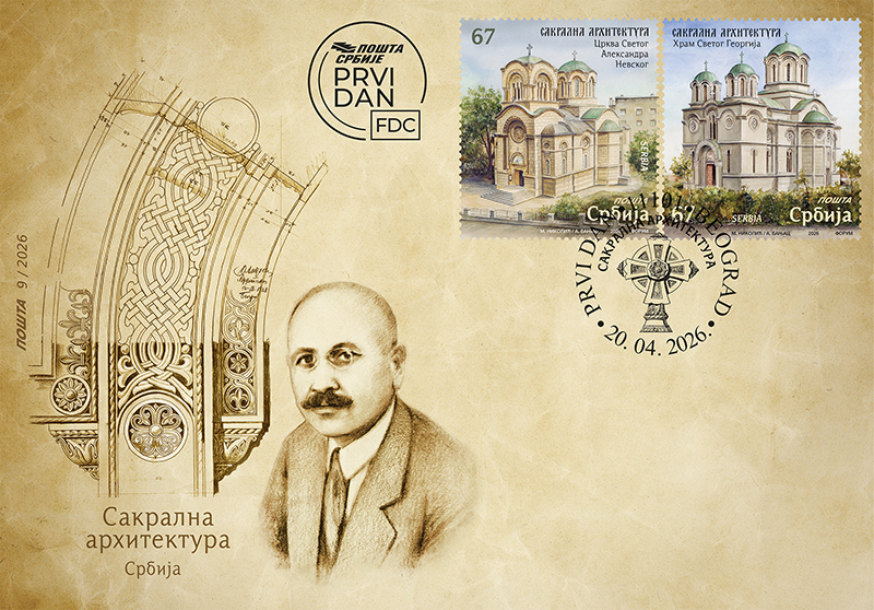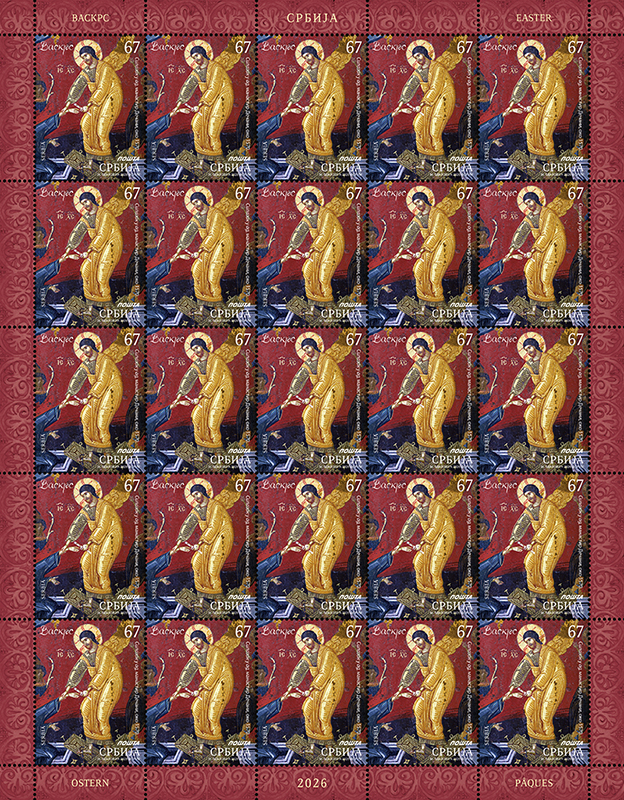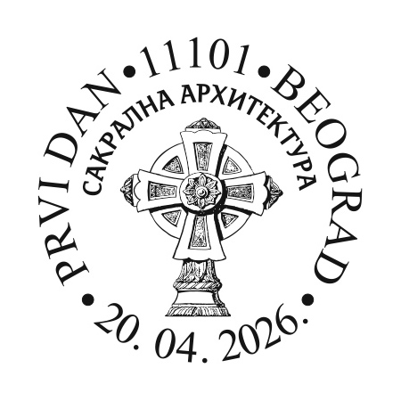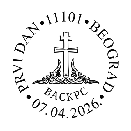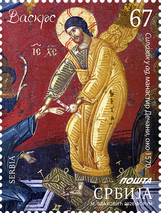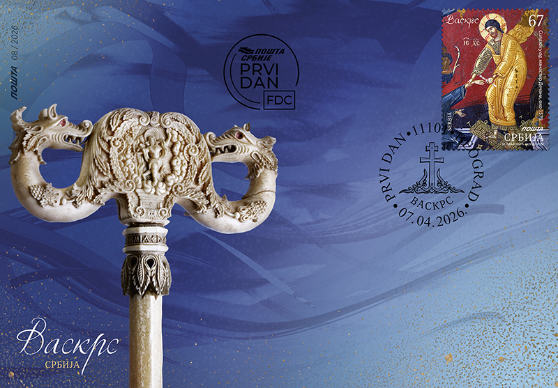 Motif on the stamp: Harrowing of Hell, 44 x 30.1 x 2.6 cm, tempera on panel, Dečani, treasury, iconographer Longinus, around 1570. Motif on the envelope: Archbishop’s sceptre of Serbian Patriarch Arsenije IV Jovanović Šakabenta, carved ivory, dimensions 165 x 18 cm, originally from the Šišatovac Monastery, unknown author, 1725–1748, Serbian Orthodox Church Museum.