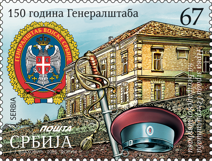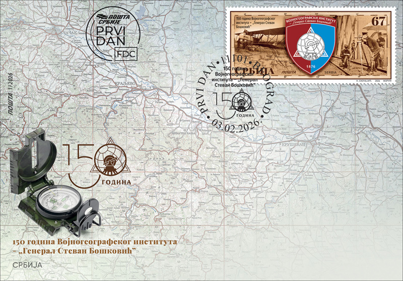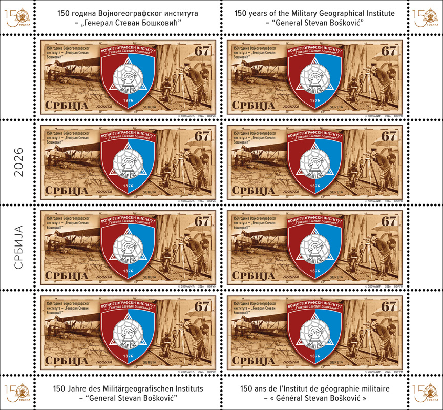 Нацрт: 1428 – амблем Војногеографског института “Генерал Стеван Бошковић“, у позадини фотографија старог премера на којој је генерал Бошковић и фотографија старог авиона, обе из архиве.